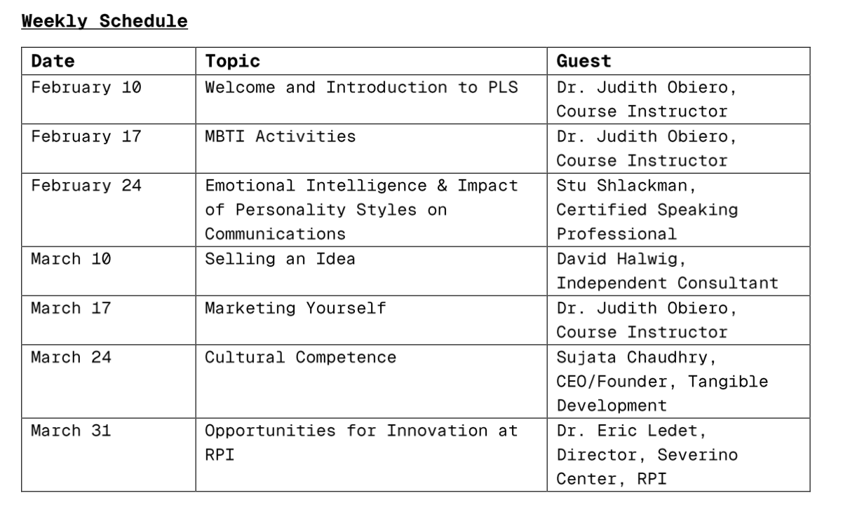Program Description: Graduate students interact with industry and campus guests once a week to explore and discuss various topics aimed at improving communication and leadership in diverse settings.